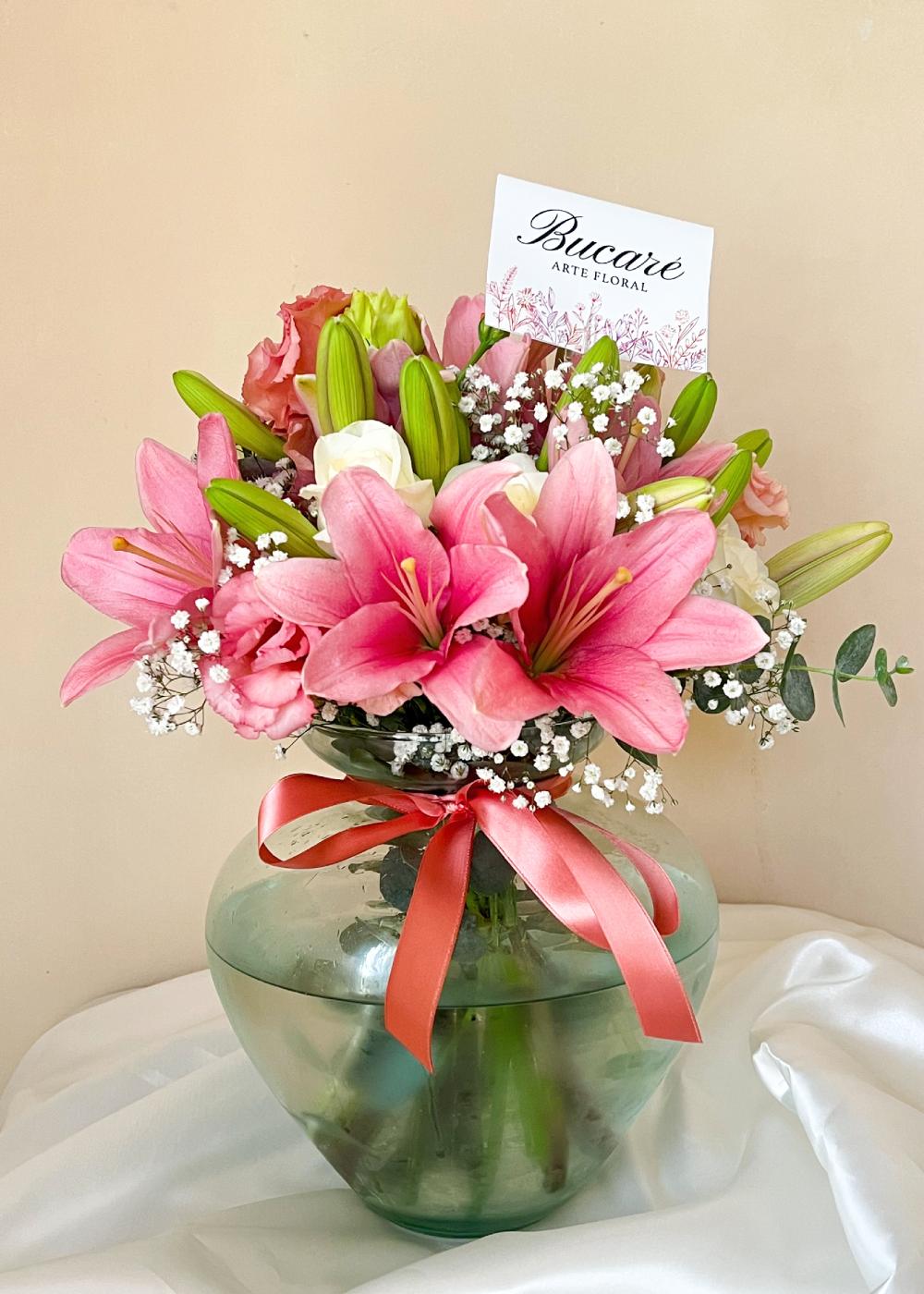 Hermoso jarrón lleno de lilys, y flores de acompañamiento disponibles, puede variar entre rosas, lisianthus, margaritas, nube y follaje verde.